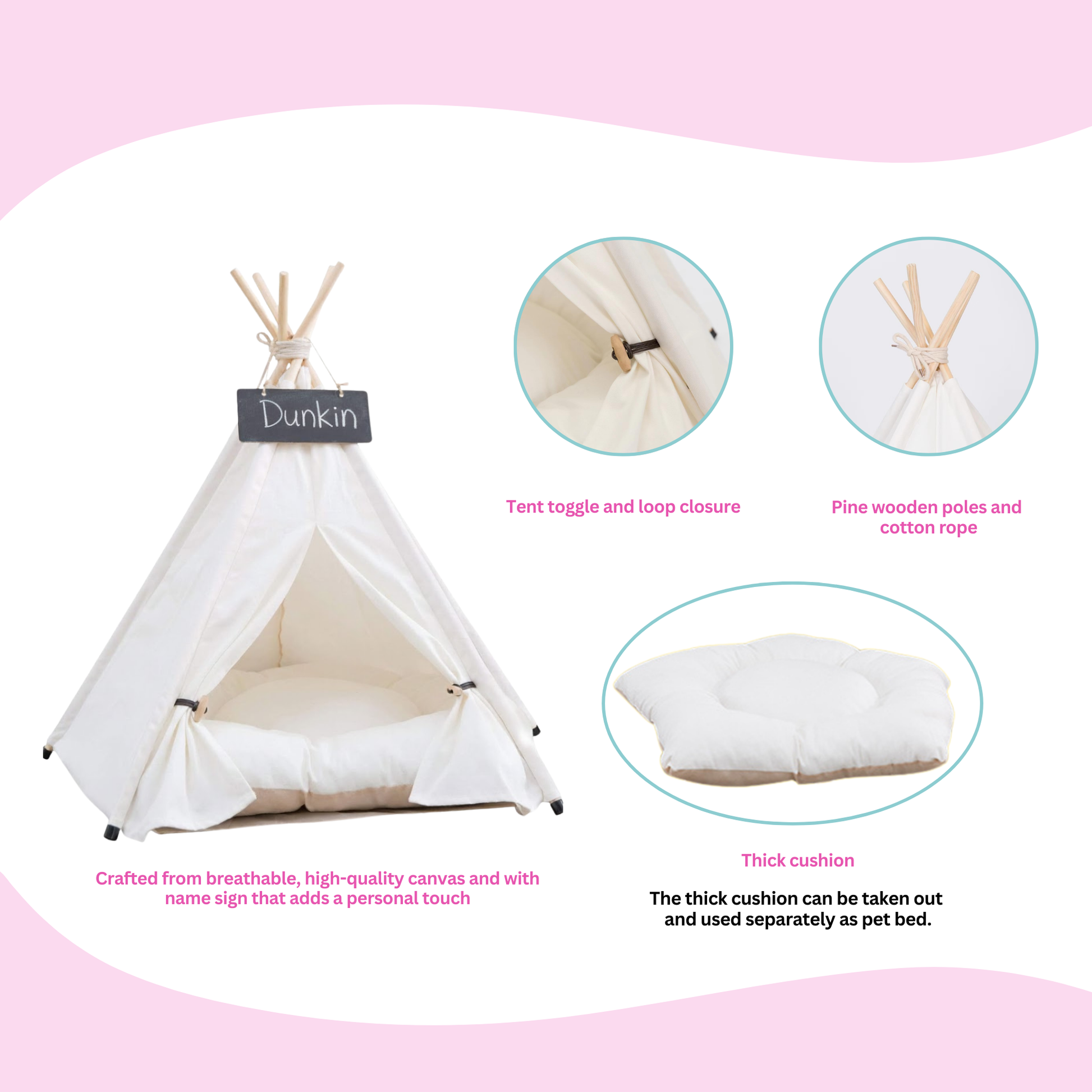 With White Pet Teepee Dog Bed foldable and easy-to-assemble design, you can take this tent dog bed anywhere you go. It even comes with its own carrying bag for added convenience. Whether you're travelling, going to the park, or camping, your pet will always have a cozy spot to call their own.